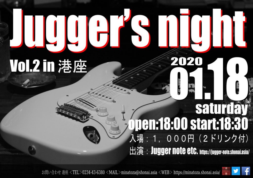 LIVE 2019/11/28 2020/1/3 01/18 Jugger’s night Vol.2 in 港座 【会場】酒田市港座 大劇場ホール 【開場】18:00【開演】18:30 【入場】1,000円(2ドリンク付) 【出演】 Jugger note 、他